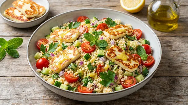 2. De snelle maaltijdsalade: Lauwwarme couscoussalade met gegrilde halloumi en munt